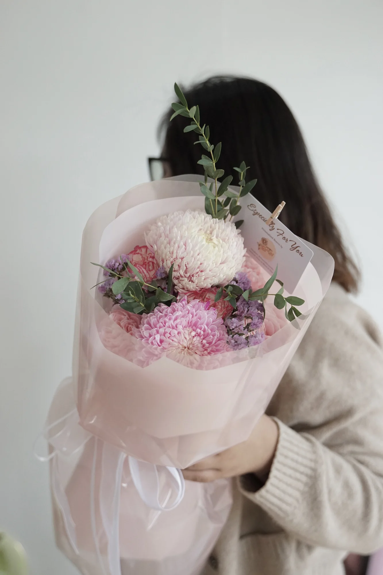 This stunning bouquet features a cheerful blend of textured blooms, including a large, fluffy pink and cream chrysanthemum, smaller pink chrysanthemums, and coordinating pink carnations. Rich purple filler flowers and vibrant green eucalyptus add depth. The arrangement is beautifully wrapped in soft pink paper with a sheer overlay, finished with a classic pink satin ribbon, making it a perfect gift for any joyous occasion.